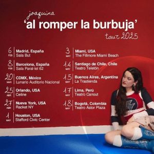 Tras el concierto de Miami, la gira ‘al romper la burbuja tour 2025’de JOAQUINA continuará por Latinoamérica con próximas paradas en Chile, Argentina, Perú y Colombia.